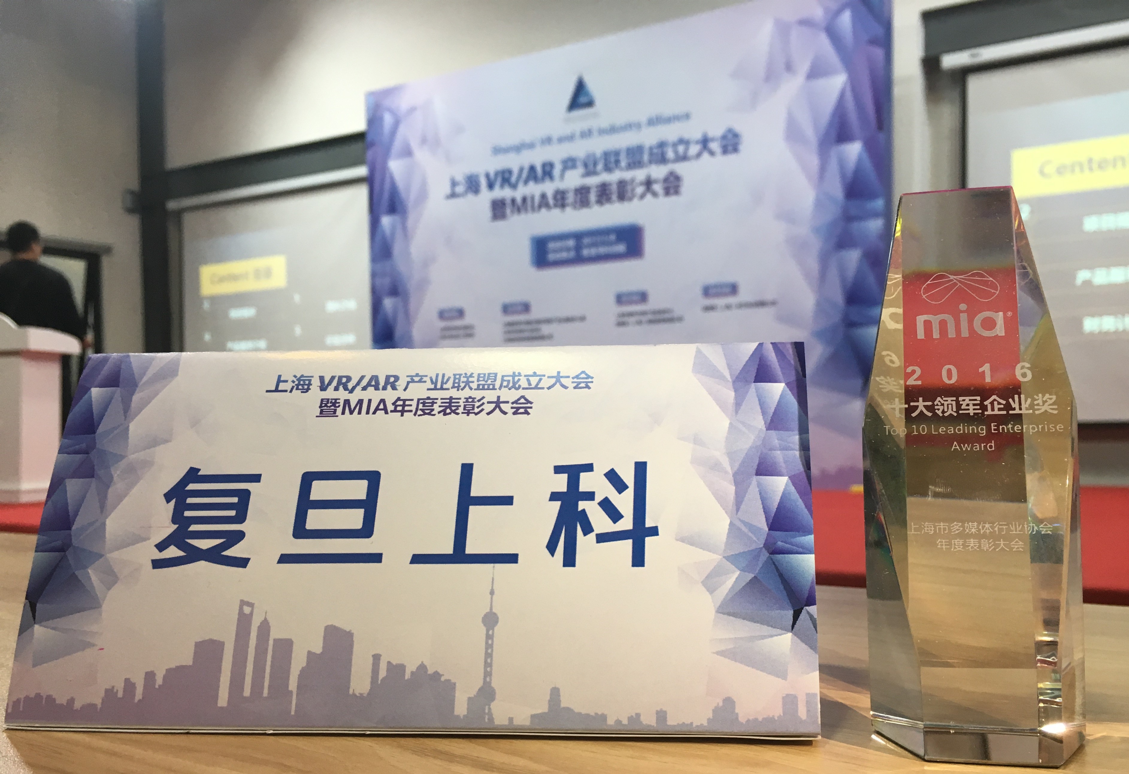 2017.01復旦上科榮獲2016年上海市多媒體行業協會(MIA)十大領軍企業獎 上海市多媒體行業協會年會暨中國VR,AR產業聯盟成立大會在寶山盛大召開,會議由寶山區常委副區長夏雨先生主持,復旦上科榮獲多媒體行業年度十大領軍企業大獎,復旦上科在多媒體行業多年的開拓耕耘獲得了業界的高度認可。 -